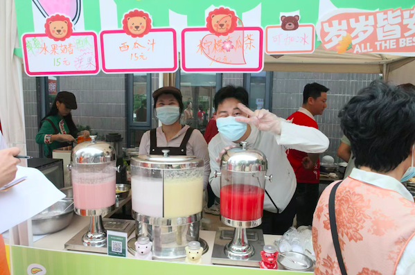 活动现场气氛热烈,家长和孩子们在玩中学,学中感悟。各个活动区域玩得不亦乐乎,欢声笑语不断。与此同时,现场还设置了各类义卖摊位,也同时成为了众人瞩目的焦点。来自山东泰安、天津、北京等多个地区的热心义工们纷纷大展手艺,现场制作了煎饼菓子、素食汉堡、酸奶粽子等各式美食,色香味俱佳,深受大家喜爱。除此之外,还有精美的手工刺绣、脸谱绘制、儿童图书交换等丰富多彩的项目,吸引了众多家长和孩子的积极参与。